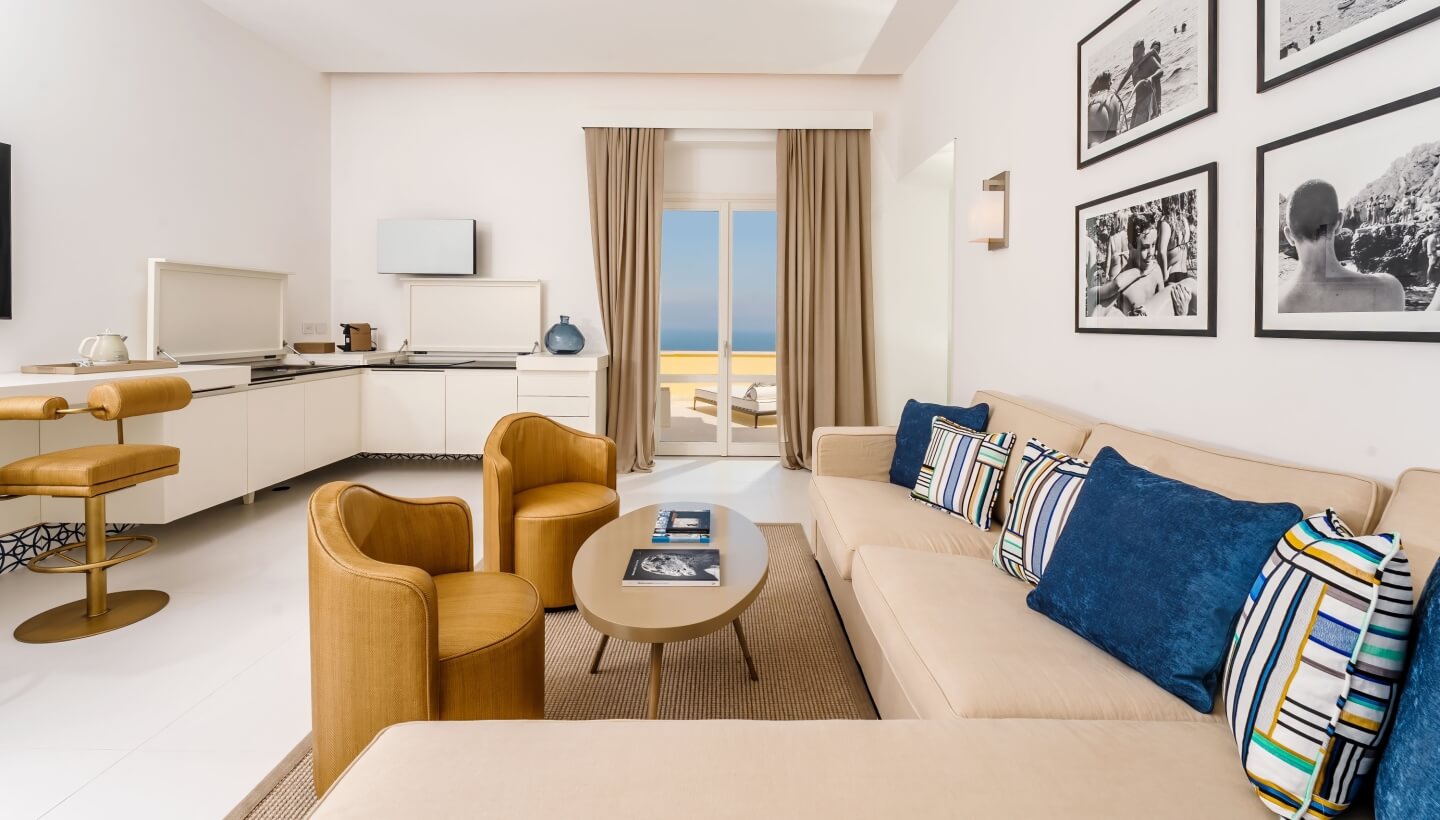 A stunning One Bedroom Suite flooded with natural light, offering a generous indoor-living space and an open space kitchen with direct access to the terrace. The suite features a double king size bed overlooking the iconic clock of the Campanile tower, a walk-in closet, a bathroom with shower and bathtub and double sinks. The beautiful furnished terrace offers the unique experience of an al-fresco dining area as well as a private jacuzzi overlooking the main square of Capri “La Piazzetta” and the Gulf of Naples.