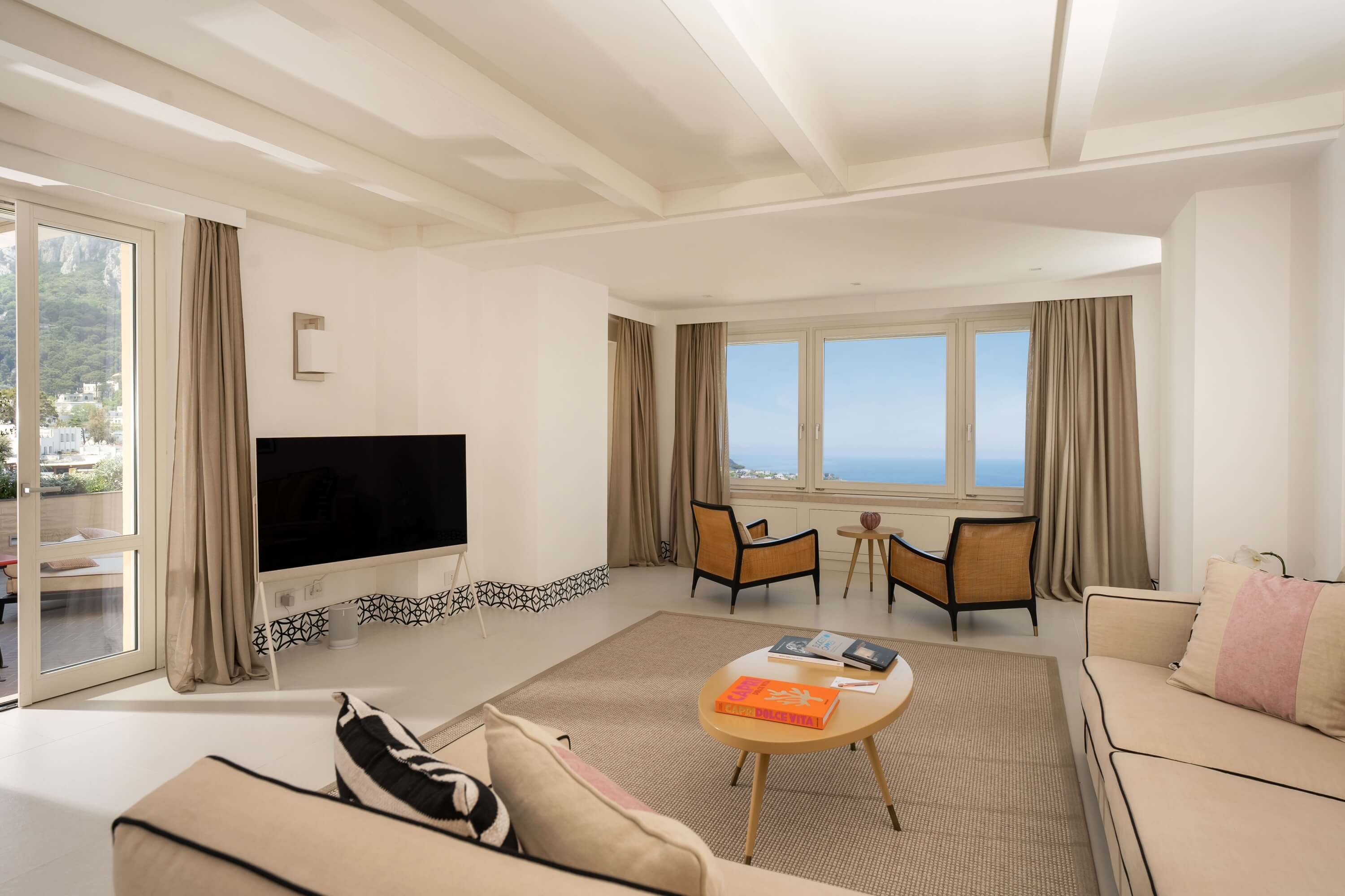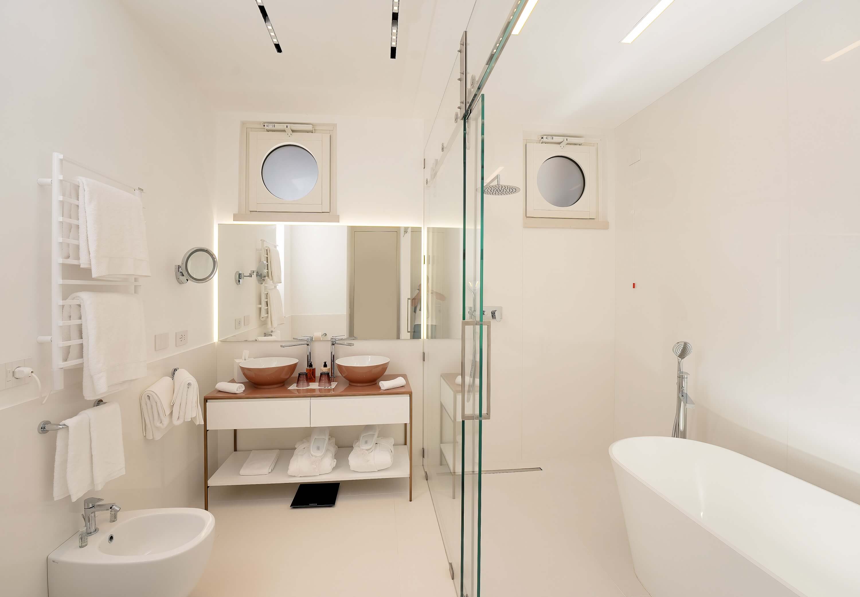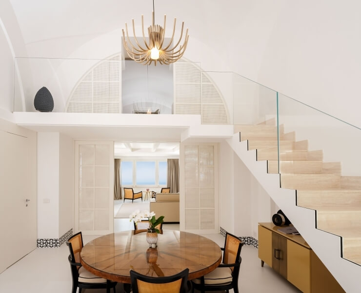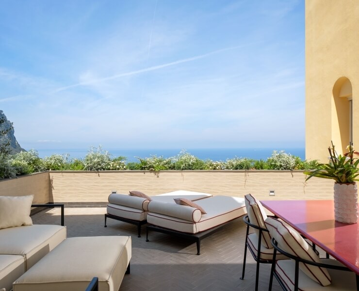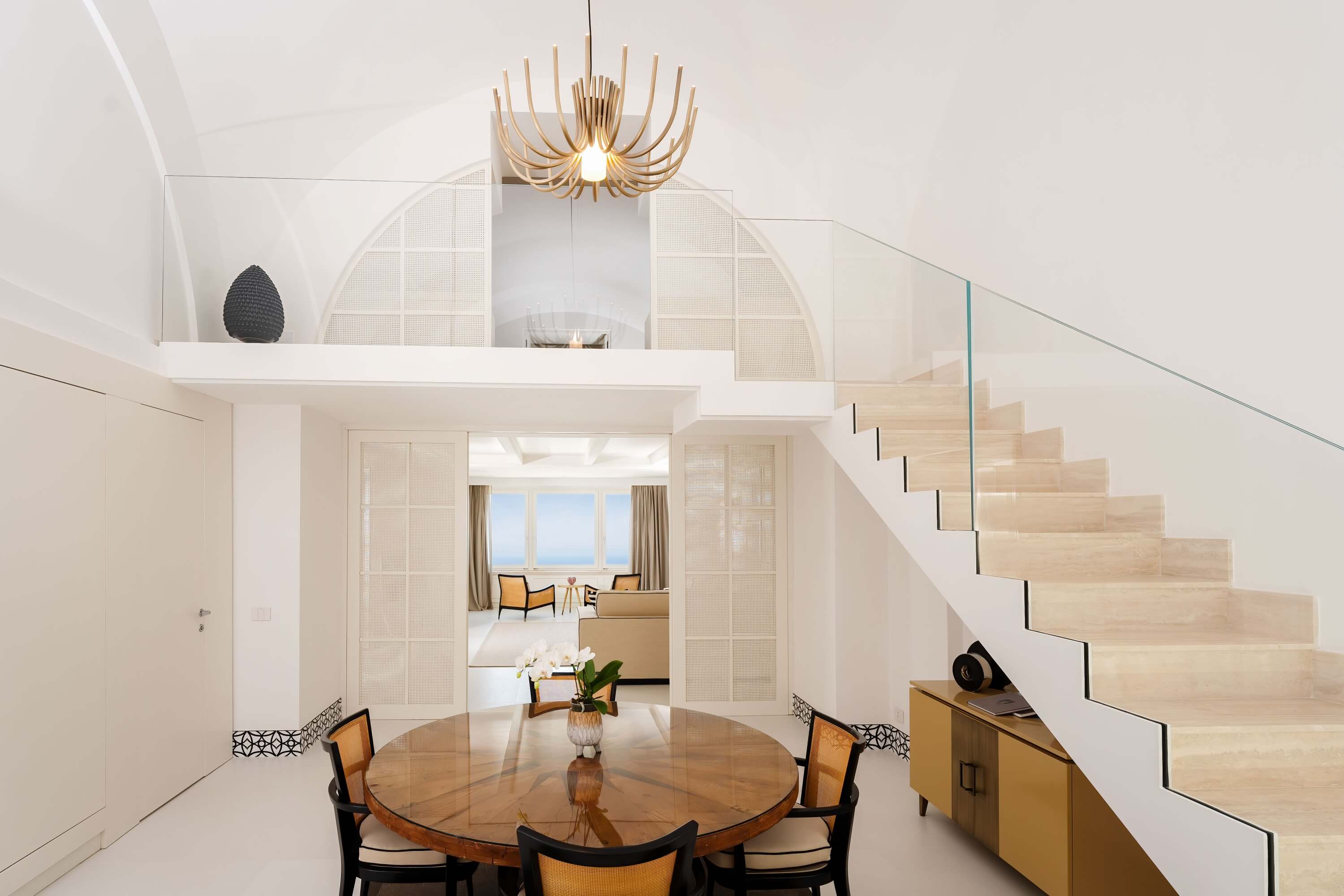 Palazzo M offre una spaziosa Duplex Suite dislocata su due livelli. Il piano terra offre una zona giorno molto luminosa, una cucina separata ed attrezzata ed un bagno padronale completo di vasca, doccia e doppi lavandini. Dal soggiorno si accede alla generosa terrazza allestita con tavolo da pranzo e lettini con vista sul Golfo di Napoli.