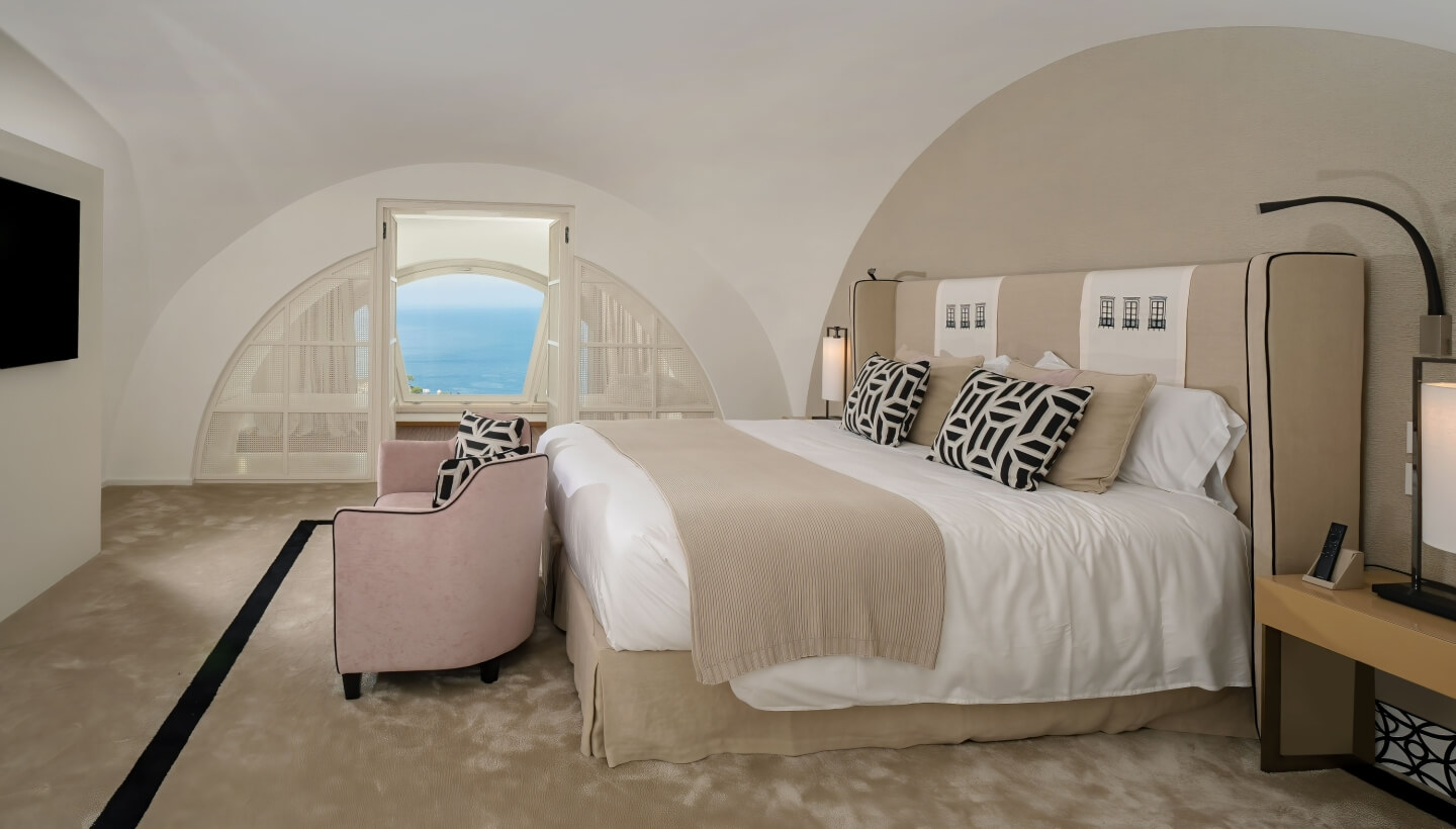 Above, sits a panoramic master bedroom with a double king size bed and spacious bathroom with shower overlooking the sea.
